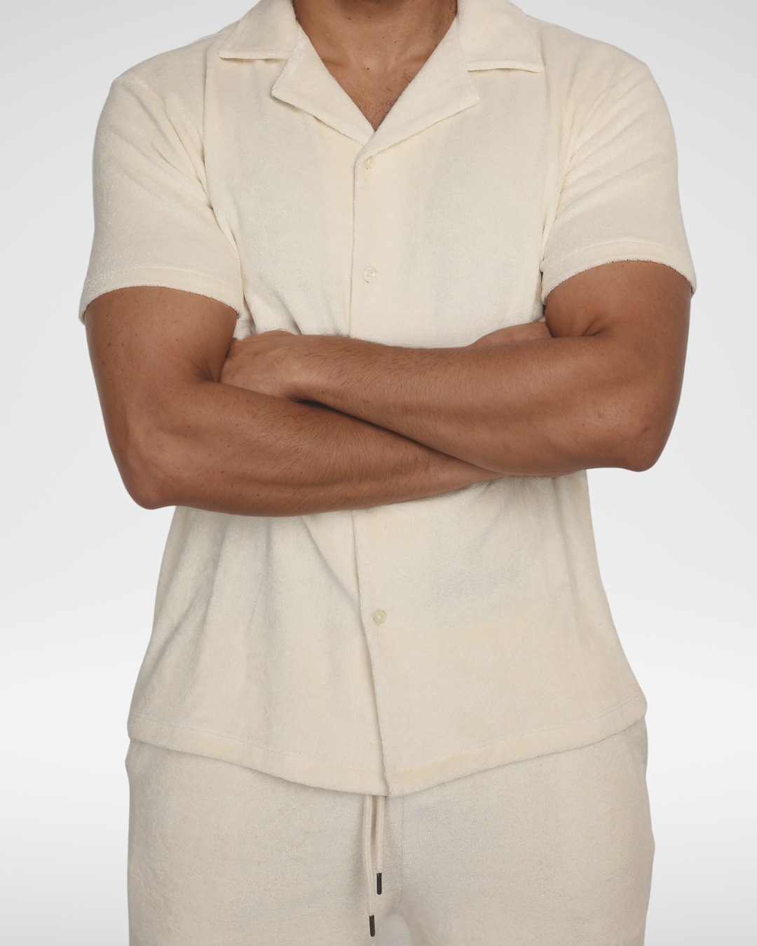 Haut : chemise manches courtes, col cubain, fermeture boutonnée
